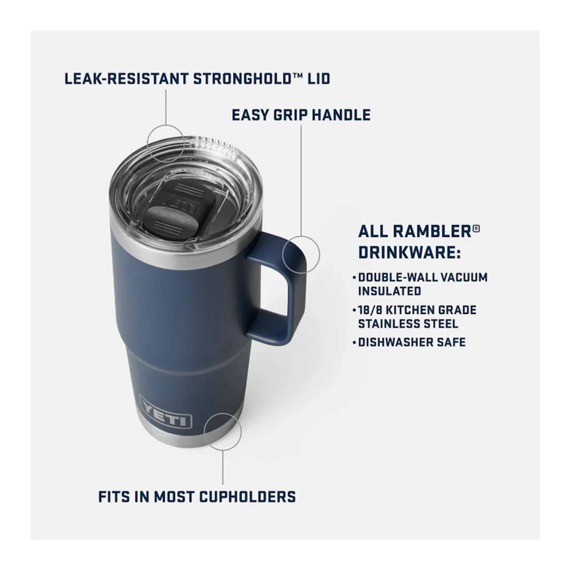 This double-duty, on-the-go drink handler is topped with the Rambler® Stronghold™ Lid — a leak-resistant, twist-on upgrade that’s backed with dual-slider magnet technology. This lid easily rotates to fasten for both right-and left-handed users, adding a strong layer between your free-flowing drink and the outside world. And if we’re talkin’ about where to take it, its elevated handle lets you enjoy cupholder convenience just about anywhere.